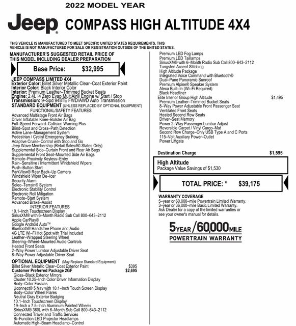 CARFAX One-Owner. Clean CARFAX. 2022 Compass High Altitude Passes Safety Inspection, Compass High Altitude, 4WD, Billet Silver Metallic Clearcoat, Black Leather, 10.1" Touchscreen Display, 115V Auxiliary Power Outlet, 2nd Row Heated Seats, 2nd Row USB Type A/C Charge Only, 4G LTE Wi-Fi Hot Spot, Alexa Built-In, Auto High Beam Headlamp Control, Auto High-beam Headlights, Automatic temperature control, Black Headliner, Body Color Door Claddings, Body Color Exterior Sill Moldings, Body Color Fascias, Body Color Wheel Flares, Cluster 10.25" TFT Color Display, Connected Travel & Traffic Services, Disassociated Touchscreen Display, Driver Seat Memory, Elite Interior Group High Altitude, Foot Activated Open 'N Go Liftgate, For Details, Visit DriveUconnect.com, For More Info, Call 800-643-2112, Global Telematics Box Module (TBM), Gloss Black Exterior Mirrors, Gloss Black Surround/Neutral Gray Rings, GPS Navigation, Gray Day Light Opening Moldings, HD Radio, Heated front seats, High Altitude Package, Integrated Voice Command w/Bluetooth, LED Low/Highbeam Projector Headlamps, Liquid Chrome/Chainmail Hydro Accent, Neutral Gray Exterior Accents, Neutral Gray Exterior Badging, Neutral Gray Side Roof Rails, ParkView Rear Back-Up Camera, Power 8-Way Adjust Front Passenger Seat, Power Front/Fixed Rear Full Sunroof, Power Liftgate, Premium Alpine Speaker System, Premium Leather Trimmed Bucket Seats, Premium LED Fog Lamps, Premium Taillamps, Quick Order Package 2GF High Altitude, Radio: Uconnect 5 Nav w/10.1" Display, Remote keyless entry, Reversible Carpet/Vinyl Cargo Mat, SiriusXM Guardian - Included Trial (B), SiriusXM Radio Service, SiriusXM Satellite Radio, SiriusXM w/360L, Steering wheel mounted audio controls, Tungsten Accent Stitching, Ventilated Front Seats, Wheels: 19" x 7.5" Aluminum Painted. 4WD 9-Speed 948TE Automatic 2.4L I4 Odometer is 1623 miles below market average!